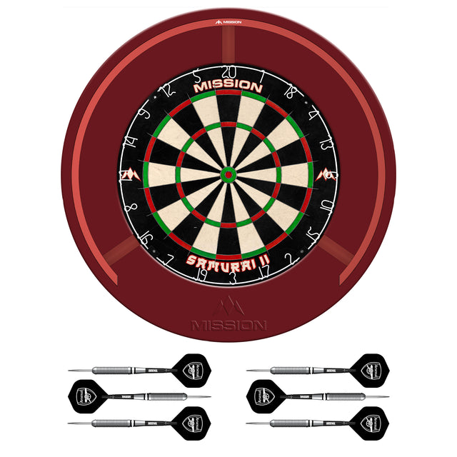 Mission Samurai II x Arsenal Dartboard Set - Dart Board, Surround, Torus 270 Light & 2 sets of Brass Darts - Red is backordered and will ship as soon as it is back in stock.